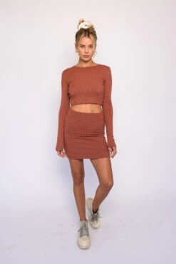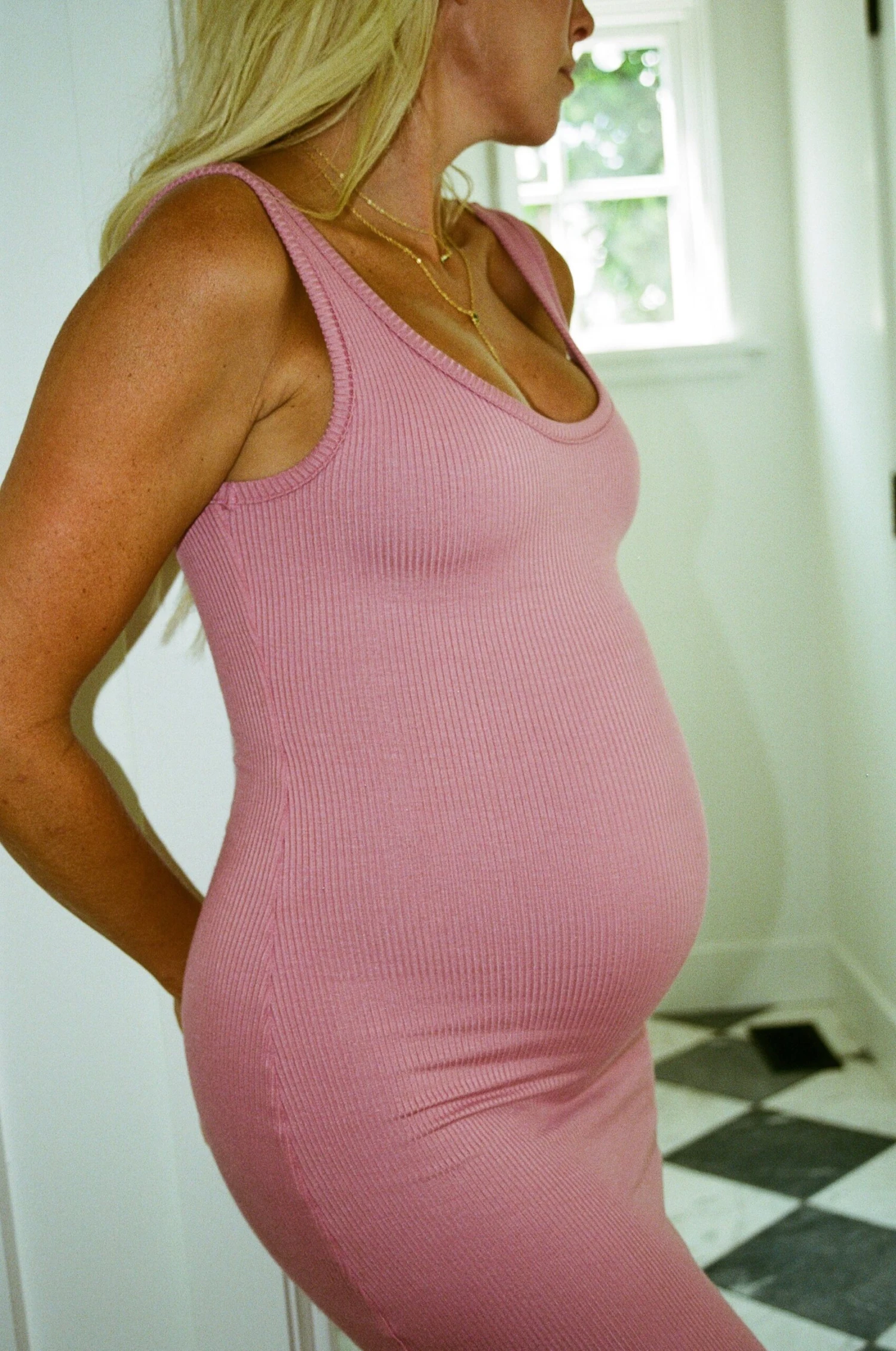 This dress was inspired by our Stephanie Tank. This midi dress update is double-lined in the front and her thick straps were designed to hide bra straps. She’s got a tight fitting silhouette that’s a long midi crop.