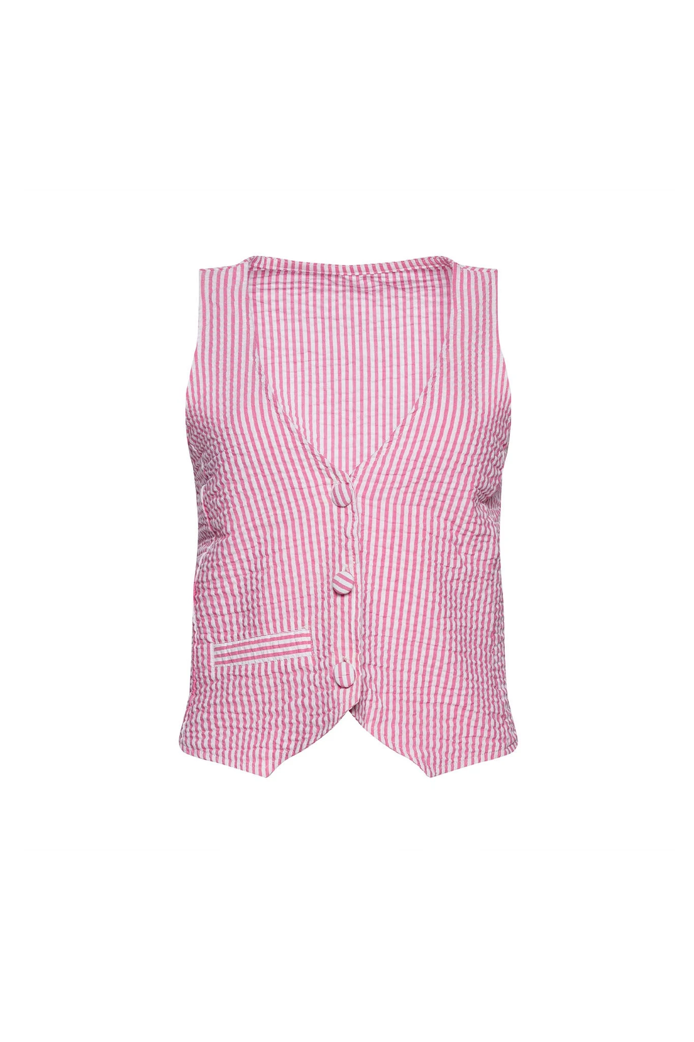Beau is a relaxed-fit, seersucker vest with an emphasis on relaxed. The slightly longer length feels more sophisticated than some of the other styles out there, and the fabric-covered buttons are functioning. Wear Beau open with a bralette underneath or closed on its own.