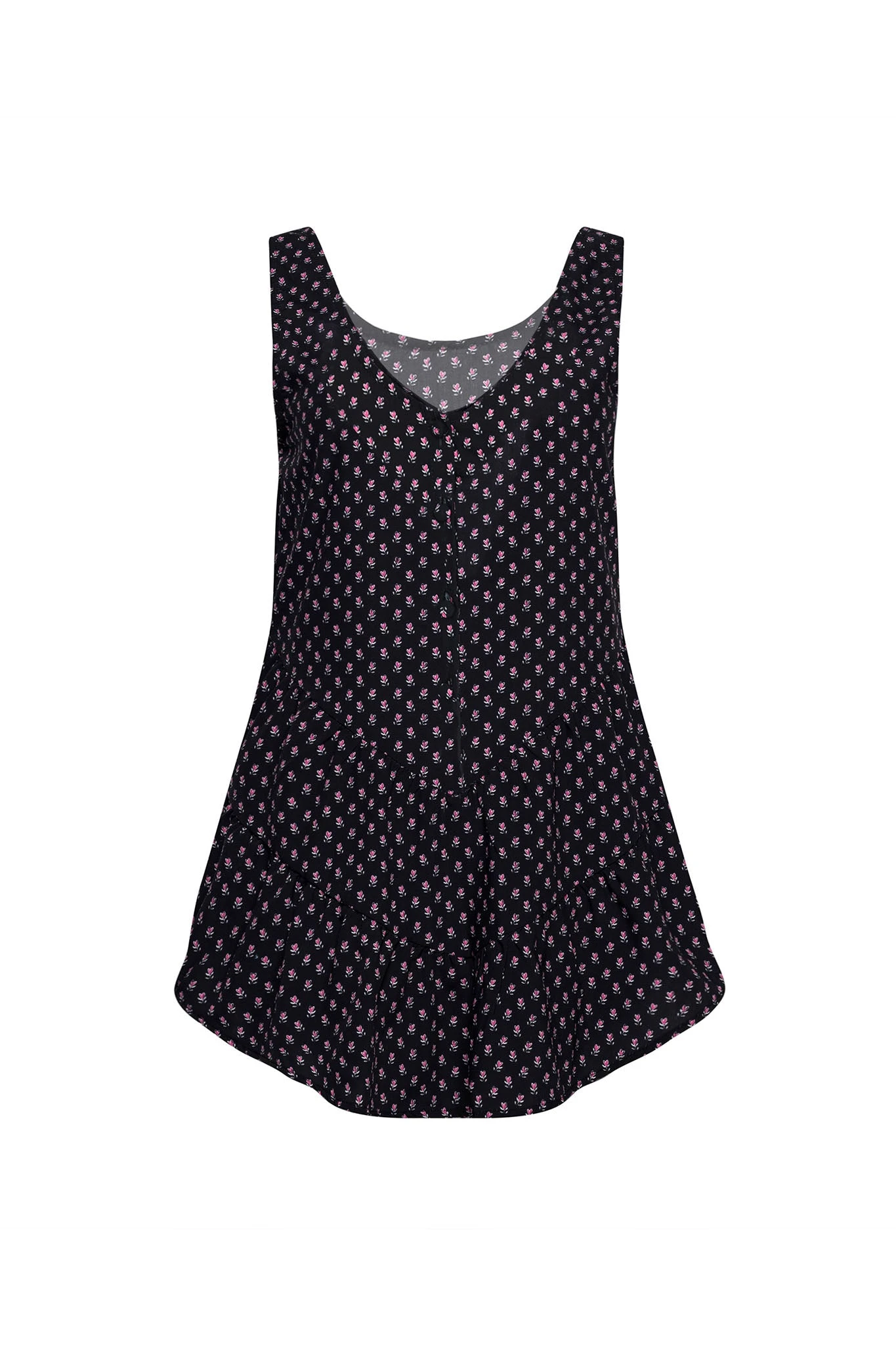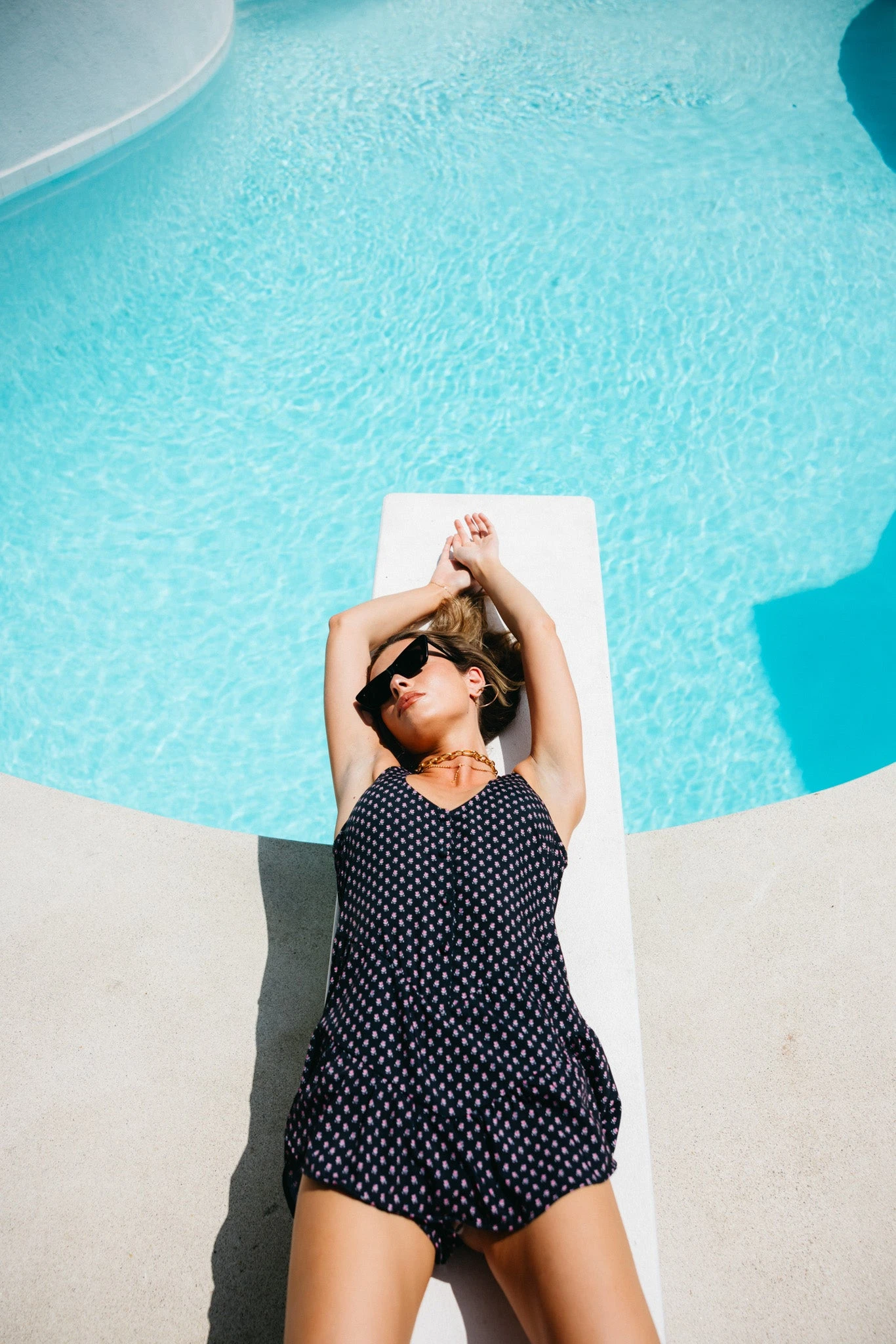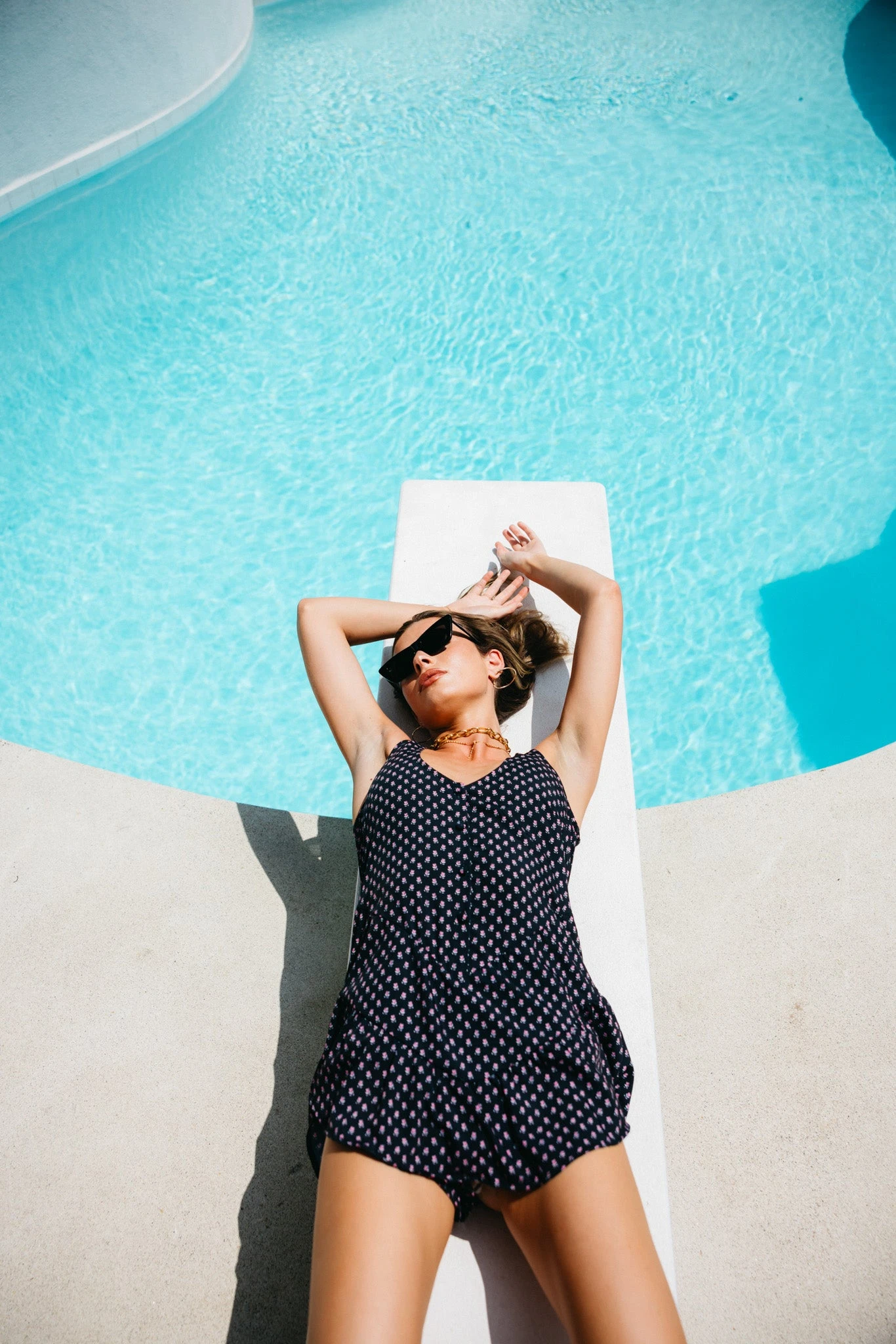 A romper that looks like the perfect little mini dress. The button-down, drop waist front is bra-friendly, and her ultra-short skirt has built-in shorts, so tall girlies won’t have to worry about anything showing. Camille’s corset-inspired look is loose, effortless, and chic.