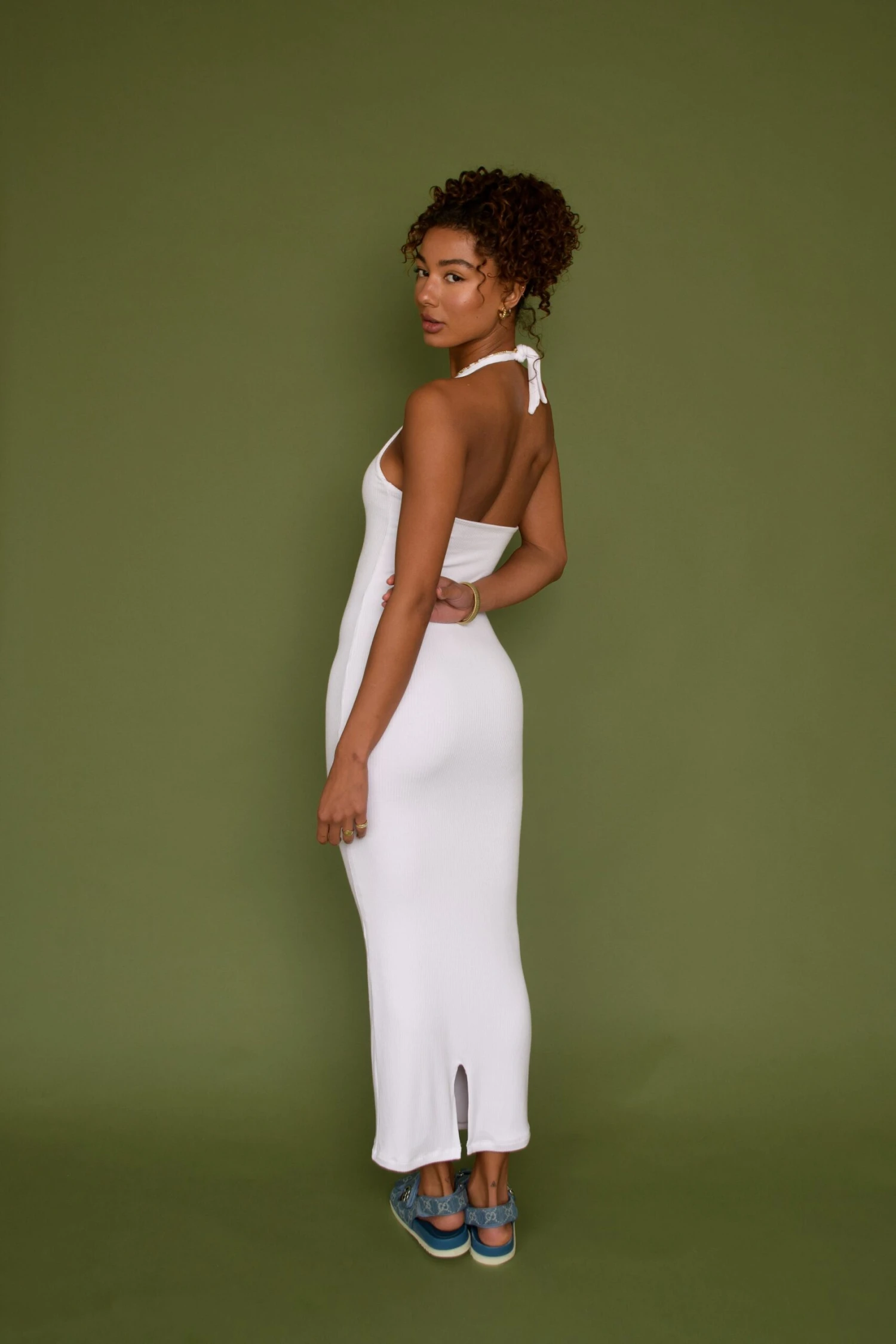This maxi form fitting dress has a top that can be worn multiple ways. Tied around your neck in a keyhole or halter style in the front or tie it in the front for a classic tube top. Dress her up or down, she is chic enough to wear to a wedding, but comfortable enough to throw on and wear at home.