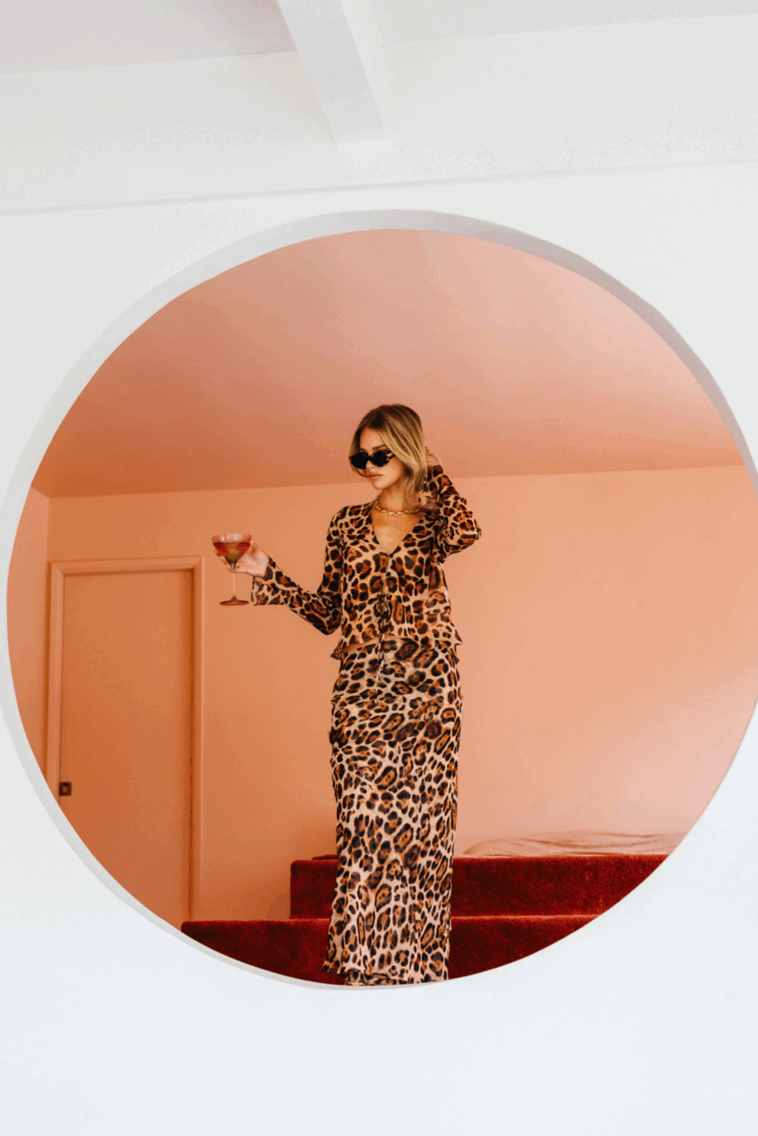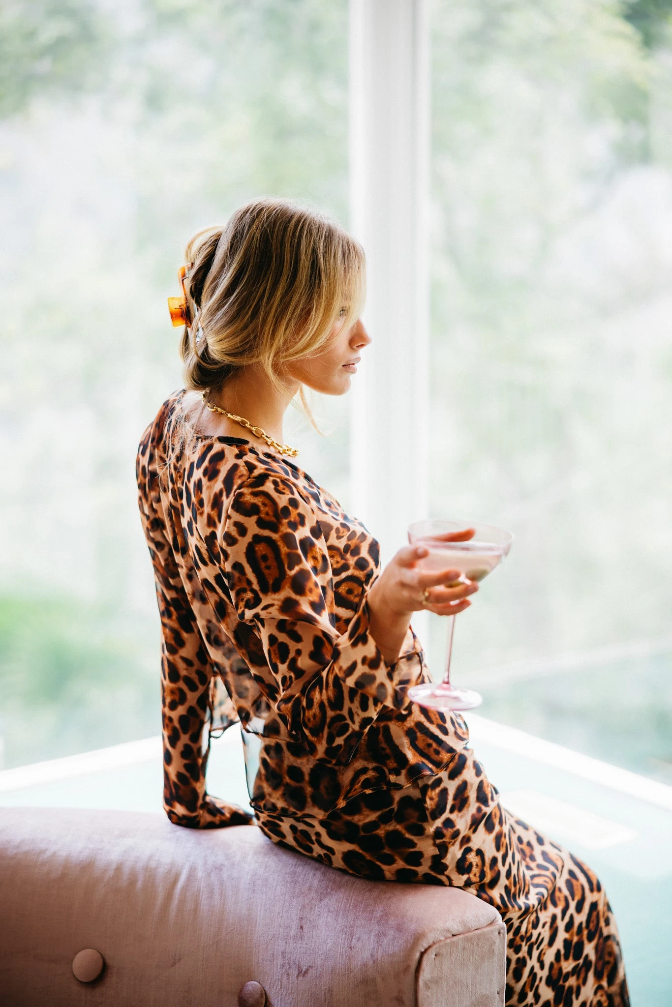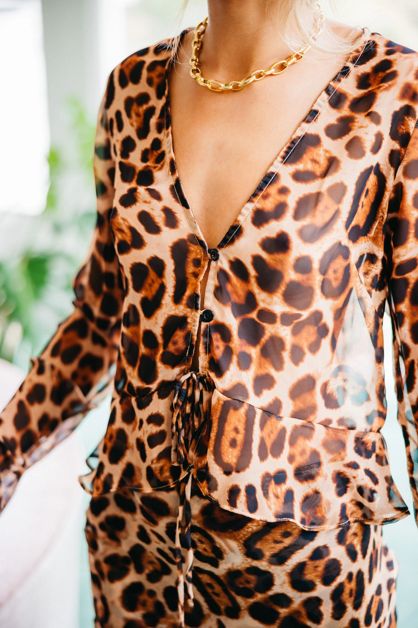 This v-neck blouse has a two-button closure and a tie at the waist, just above where the ruffled hem begins. The single-layer chiffon is slightly sheer, making Colette feel a little bit edgy.