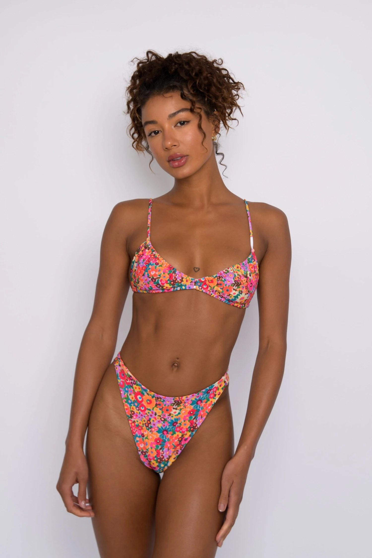 A dainty ruched bralette with a fully adjustable skimpy string style back so that you have the illusion of coverage in the front and minimal tan lines in the back.