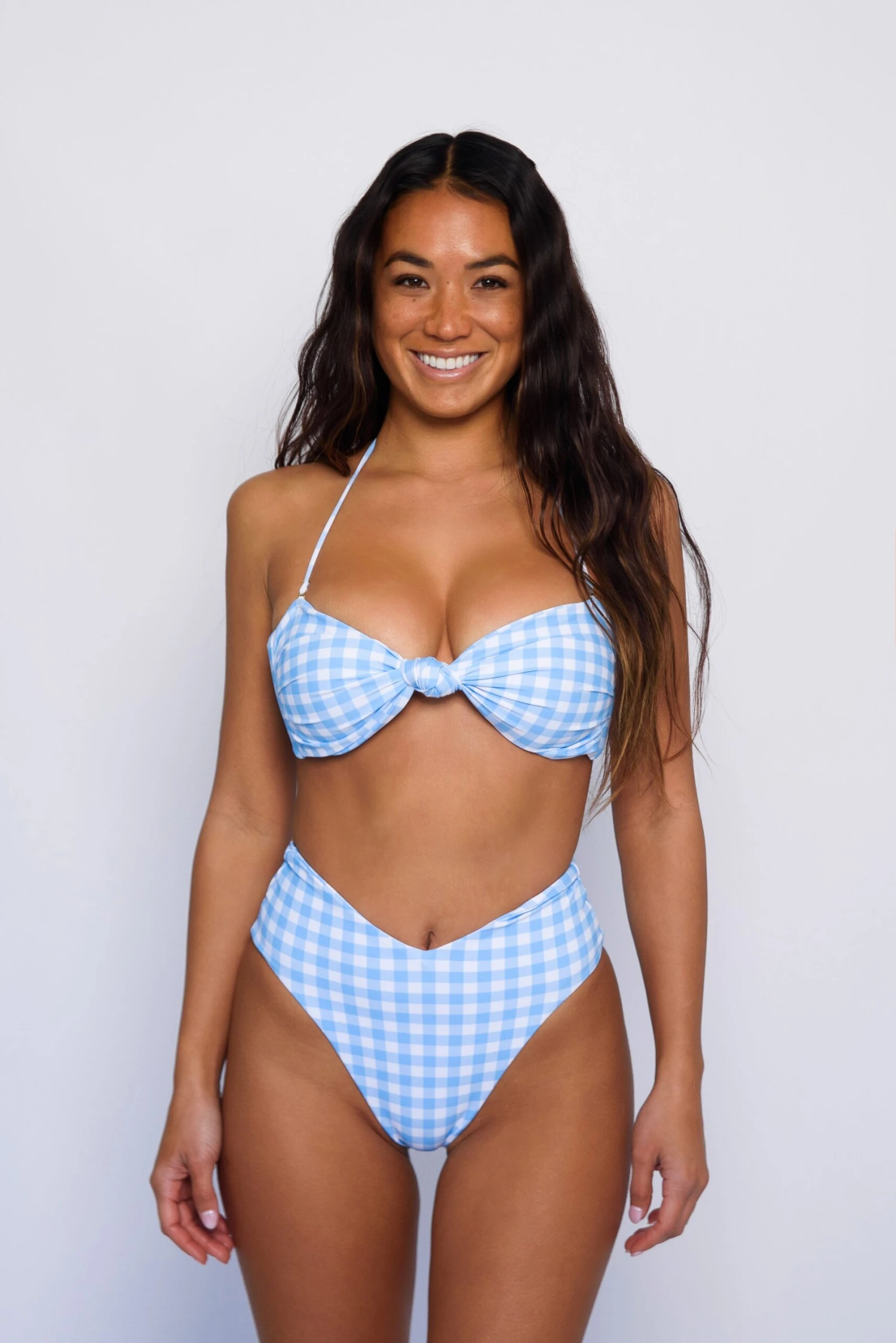 Lyndi is a knotted bandeau with removable halter straps. This top has structured sides that keep her in place, but her skimpy coverage makes her perfect for tanning! She’s got removable padding that allows the top to hold better shape.